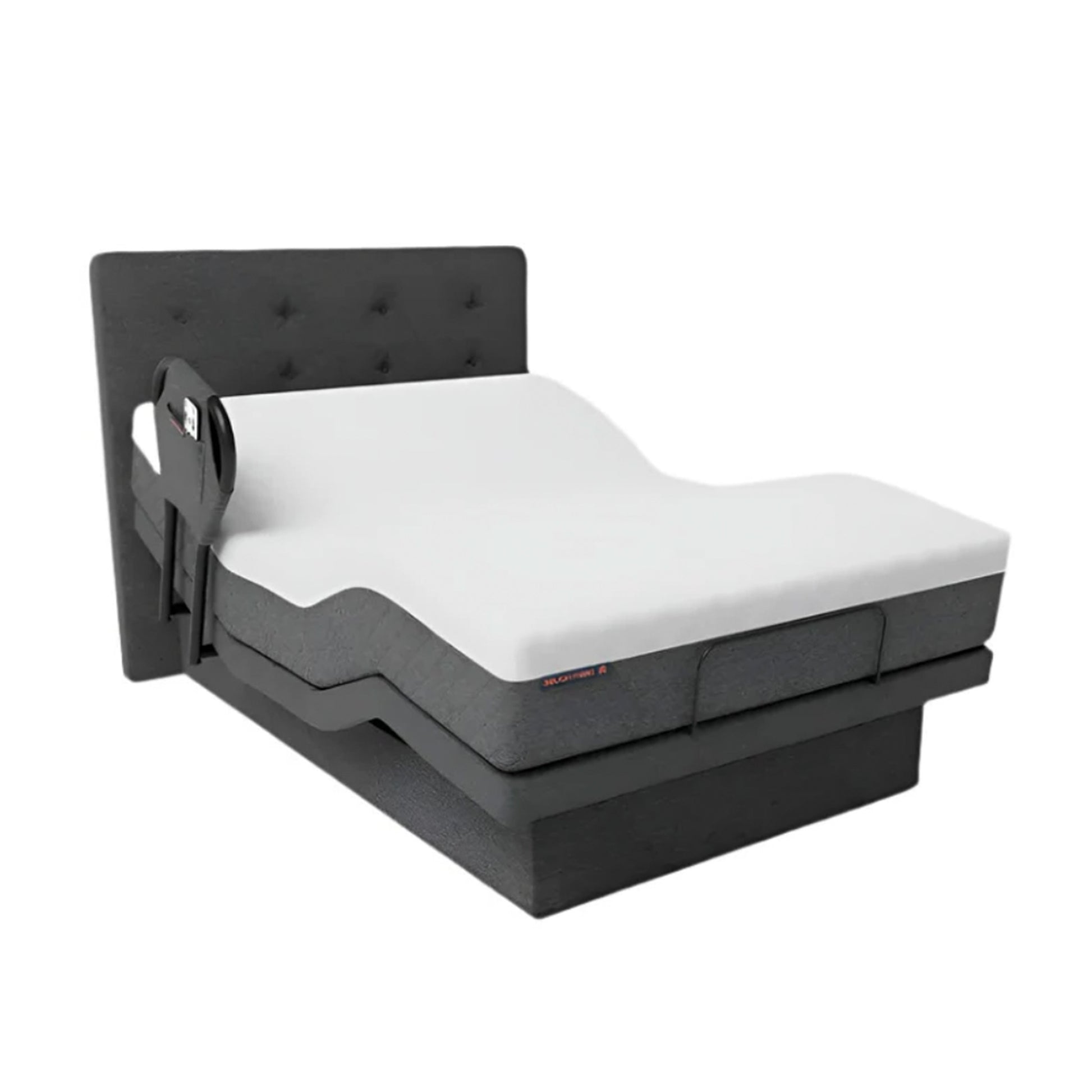 This custom sleep system offers high/low adjustable height, support rails, underbed lighting, voice command, remote control, and health monitoring.